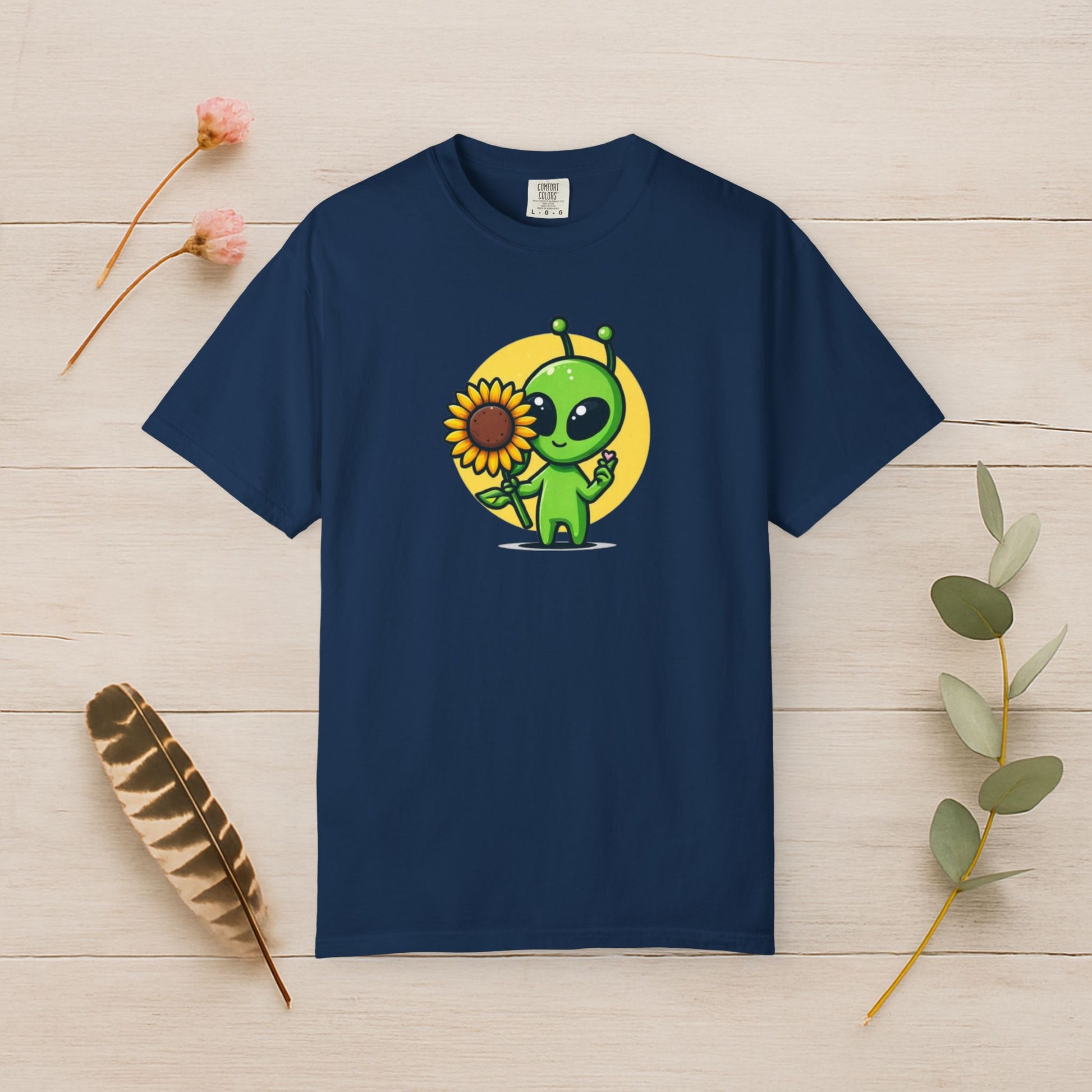 This tee features an adorable green alien holding a bright sunflower and a tiny heart, spreading pure cosmic positivity. With its cheerful colors, it’s the perfect feel-good shirt for anyone who loves cute, whimsical designs.